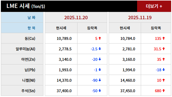 2025년 11월 20일 字 가격동향 > 원자재정보