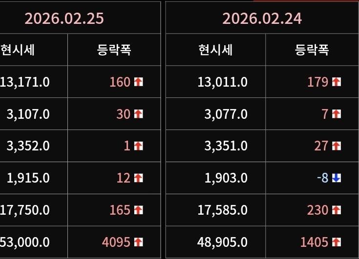 2026년 02월 25일 가격동향 본문 2026년 02월 25일 가격동향 목록 2026년 02월 26일 字 가격동향 26.02.27 2026녀ㆍ 02월 24일 가계동향 26.02.25